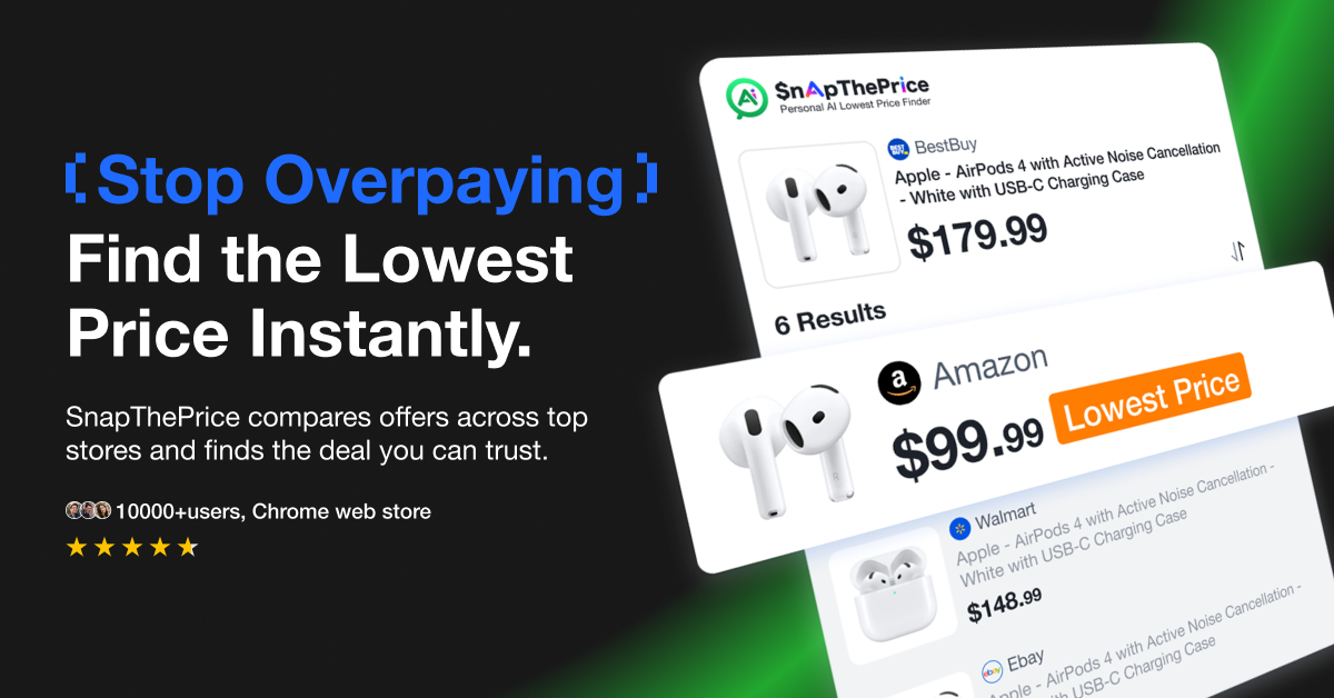 With SnapThePrice, you’ll never have to wonder if you’re getting the best deal. Our free browser extension instantly compares prices across Amazon, Walmart, eBay, and more—while the built-in AI Shopping Assistant helps you quickly decide which option saves you the most. Plus, you can earn rewards every time you shop.