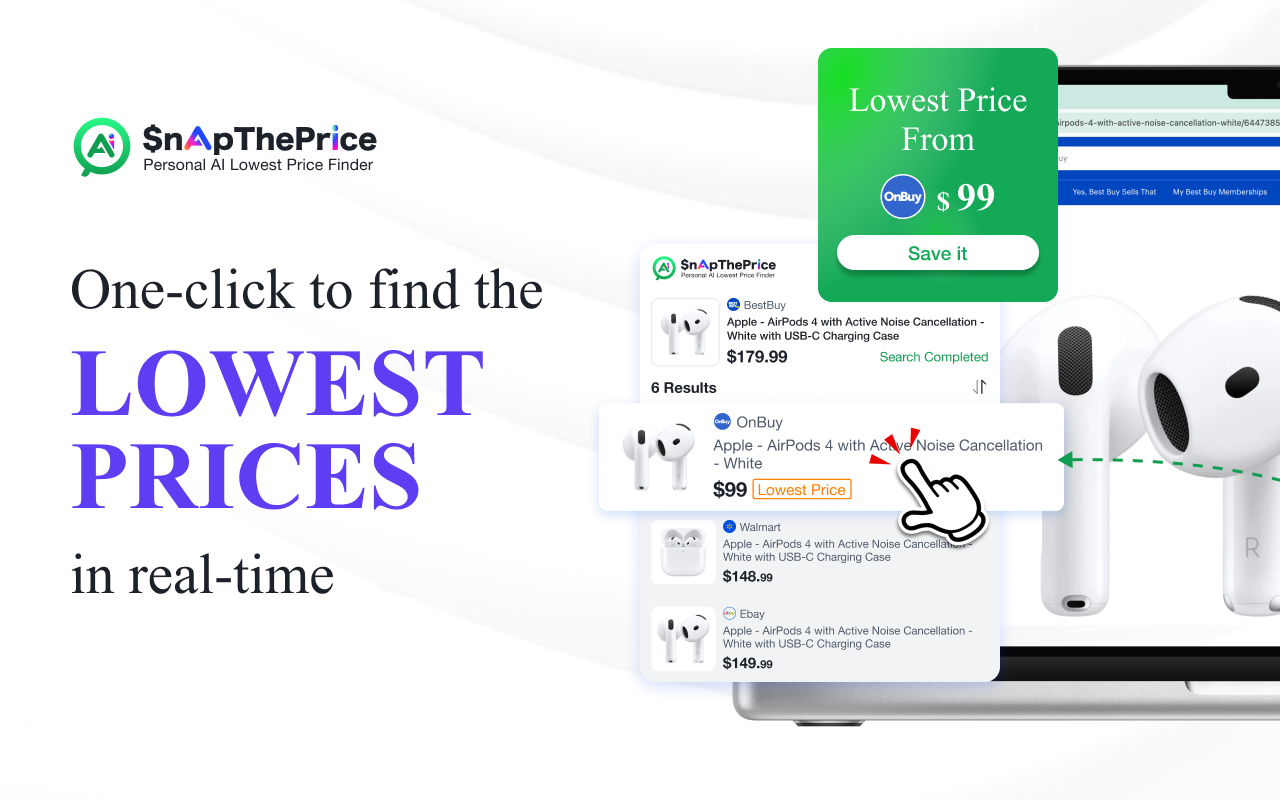 With SnapThePrice, you’ll never have to wonder if you’re getting the best deal. Our free browser extension instantly compares prices across Amazon, Walmart, eBay, and more—while the built-in AI Shopping Assistant helps you quickly decide which option saves you the most. Plus, you can earn rewards every time you shop.